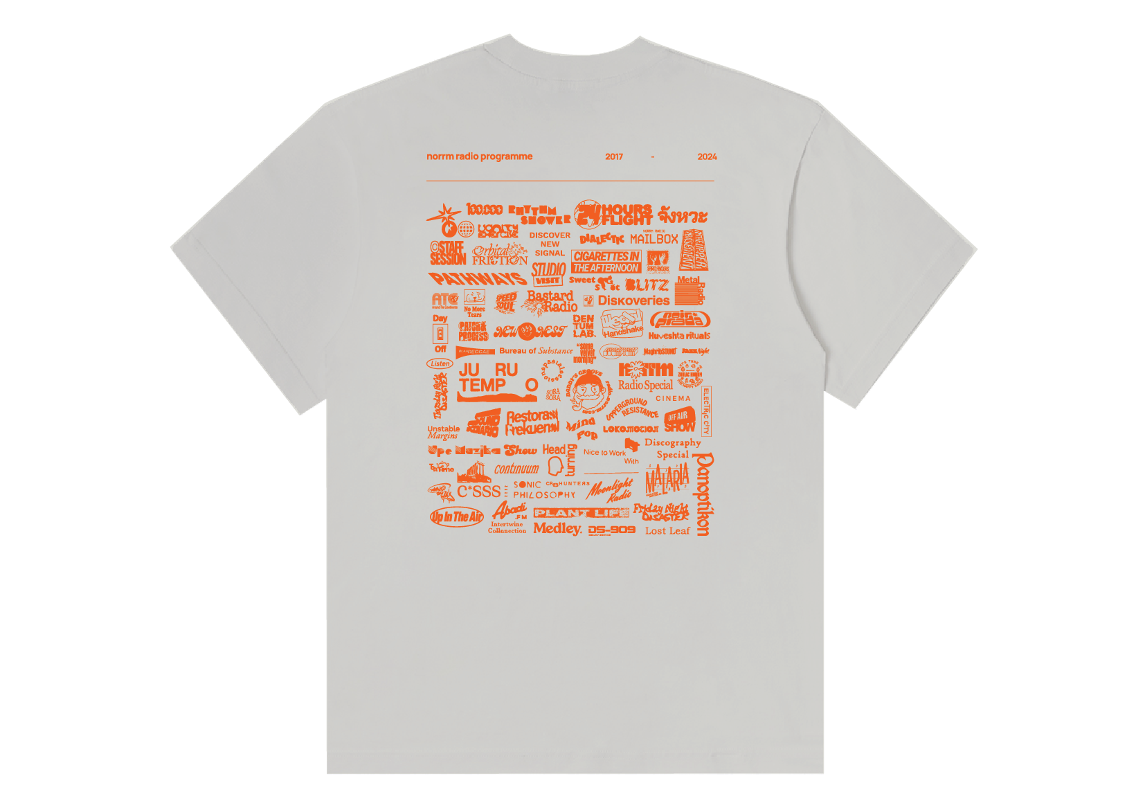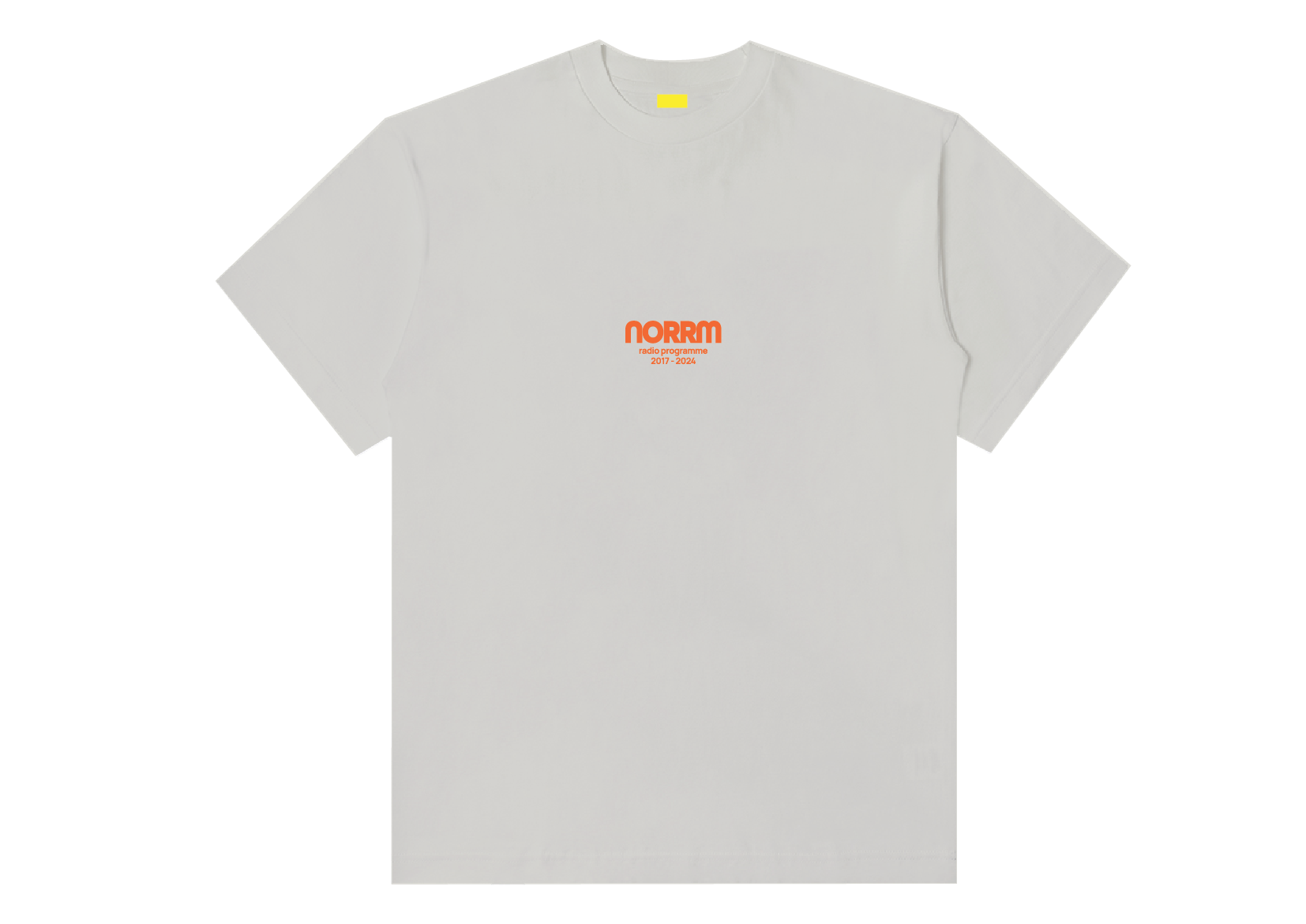 Broken White Tees and a close-fitting collar. Plastisol Screen printed "Norrm Radio Programme" in the front on 100% 20s cotton with a grammage of 180-220 gsm. Broken White Tees and a close-fitting collar. Plastisol Screen printed "Norrm Radio Programme" in the front on 100% 20s cotton with a grammage of 180-220 gsm.